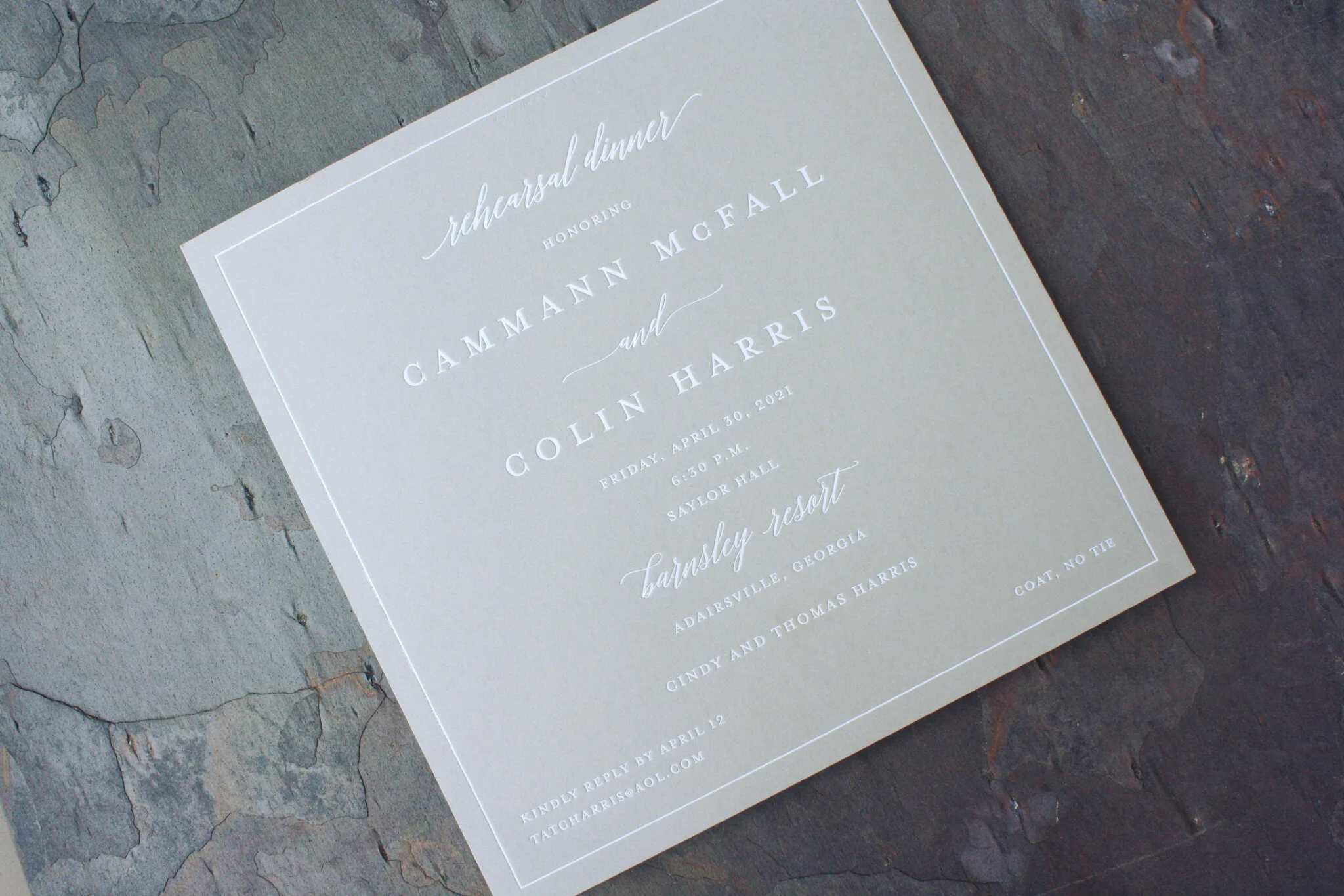 we love the wood details, in a chartreuse pop of color, that we used on the liner, menus and table numbers. the rehearsal dinner invites are a cool charcoal grey, with white foil thermography, that really tie this modern theme together. #moderndesign